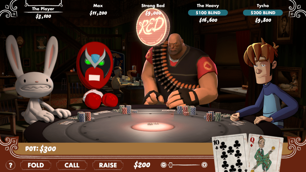 The lineup at the table is unchanged: Max (Sam & Max), Strong Bad (Homestar Runner), Tycho Brahe (Penny Arcade), and the Heavy (Team Fortress 2). What’s new is everything around the game. The visual presentation has been overhauled with higher-resolution models, reworked lighting, and cleaner animation. The poker code was rebuilt from scratch for more accurate play and smarter opponent behavior. Gamepad support is in, and you can now adjust the starting buy-in amount. Optional film grain and motion blur round out the settings for people who want a little extra atmosphere.